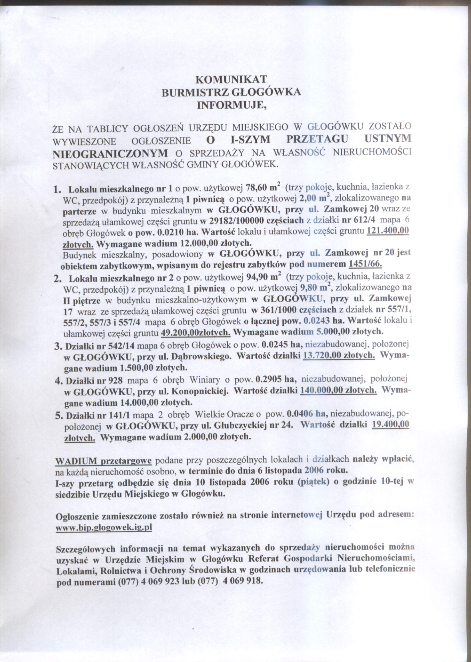 komunikat Burmistrza o I-ym ustnym przetargu na nieruchomości stanowiące własność gminy