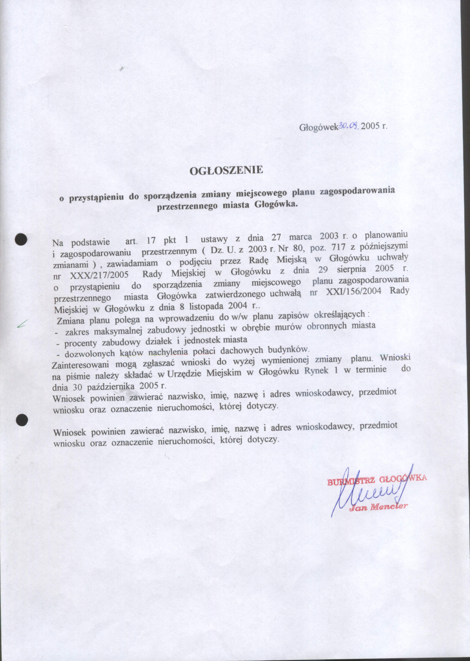 ogłoszenie o przystapieniu do sporządzenia zmiany miejscowego planu zagospodarowania przestrzennego miasta Głogówka